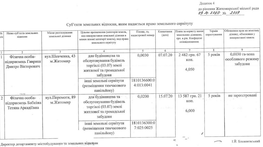 Згаданим рішення міської ради Тетяні Бабкіній на 5 років надали право земельного сервітуту на ділянку по вул.Перемоги, 89 для розміщення тимчасового павільйону. За користування ділянкою підприємиця мала сплачувати 13 тис. 587,21 грн на рік.