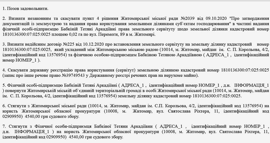 визнати незаконним та скасувати пункт 4 рішення Житомирської міської ради №2039 від 09.10.2020 «Про затвердження документацій із землеустрою та надання права користування земельними ділянками суб`єктам господарювання» в частині надання фізичній особі-підприємцю Бабкіній Тетяні Аркадіївні права земельного сервітуту щодо земельної ділянки кадастровий номер 1810136300:07:025:0025 площею 0,02 га по вул. Перемоги, 89 в м. Житомирі;