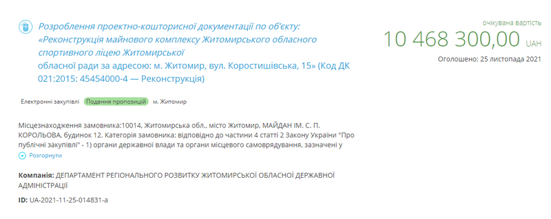 У тендерній документації зазначається, що переможець закупівлі має розробити проєктно-кошторисну документацію з реконструкції майнового комплексу Житомирського обласного спортивного ліцею, що знаходиться в Житомирі по вулиці Коростишівська, 15, до 1 квітня 2022 року. Джерело фінансування - кошти обласного бюджету та державного бюджету.