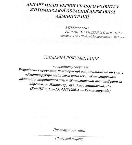 За 5 днів до рішення сесії Житомирської облради про зміну статуту і перейменування ліцею-інтернату для обдарованих дітей у спортивний ліцей, департамент регіонального розвитку ОДА 25 листопада оголосив тендер на розроблення проєктно-кошторисної документації з реконструкції майнового комплексу Житомирського обласного спортивного ліцею за адресою м. Житомир вул. Коростишівська, 15.