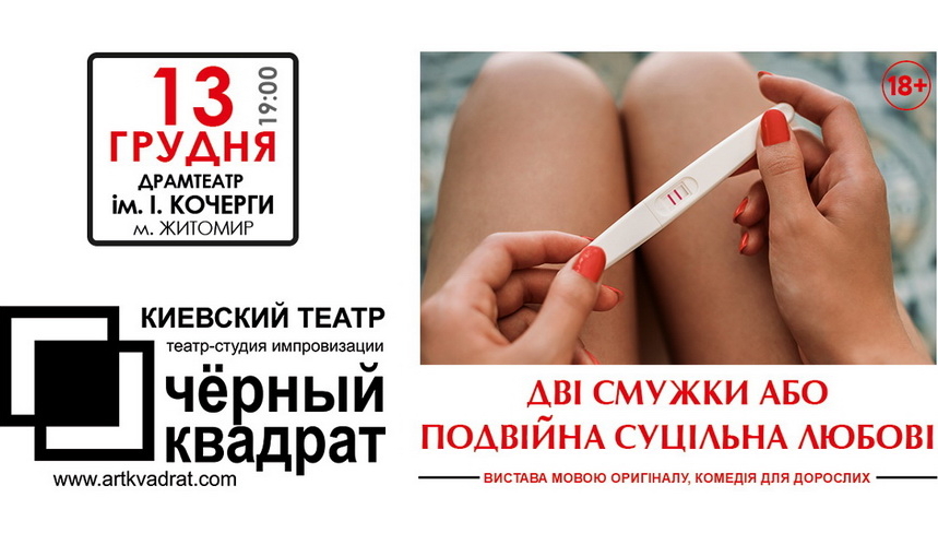 13 грудня у Житомирському драмтеатрі ім. Івана Кочерги відбудеться комедійна вистава театру «Чорний квадрат» – «Дві смужки або подвійна суцільна любові».