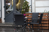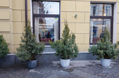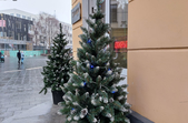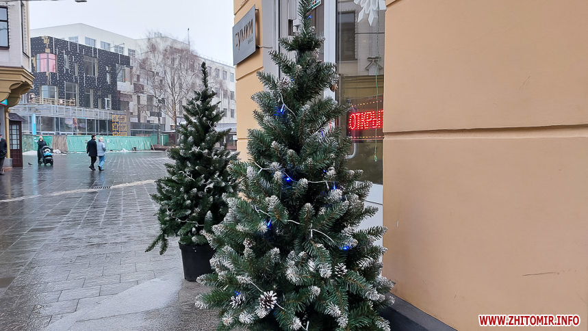 На центральній пішохідній вулиці Михайлівській заклади громадського харчування та магазини виставили ялинки у горщиках. Деякі вже встигли їх прикрасити.