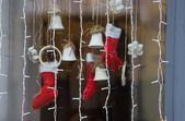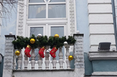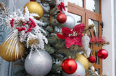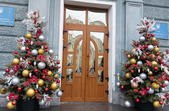 Так, на балконах приміщення міської ради розвісили прикраси у вигляді святкових шкарпеток та ялинкових іграшок, а на вході – дві справжні ялинки, прикрашені золотистими, сріблястими та червоними кульками, квітами та шишками.