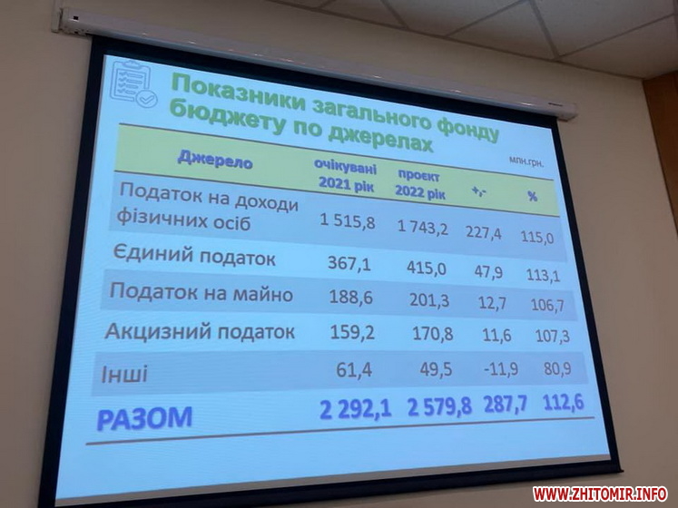 На 2022 рік доходи бюджету Житомирської міської територіальної громади заплановані в сумі 3 млрд 449,3 млн грн, у тому числі власні доходи загального фонду бюджету громади – 3 млрд 215,9 млн грн, що на 12,6% (287,7 млн грн) більше, ніж у 2021 році.