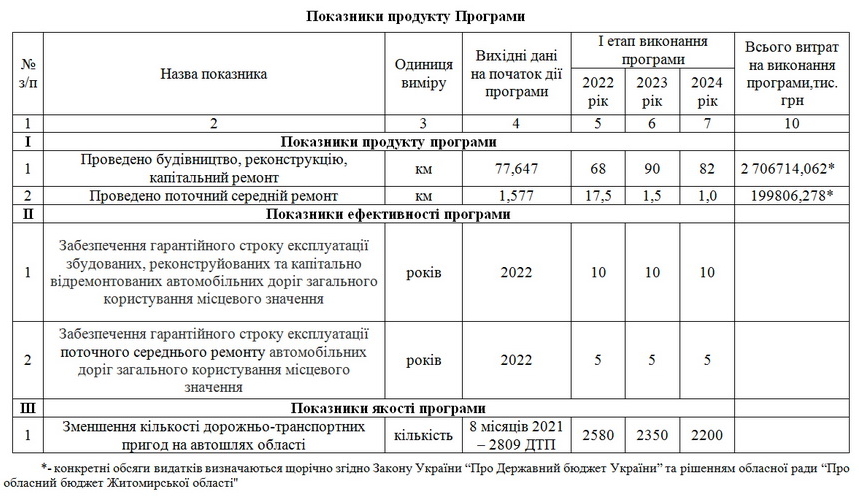 На виконання Програми розвитку дорожньої інфраструктури і фінансування робіт, пов'язаних із будівництвом, реконструкцією, ремонтом та утриманням автомобільних доріг місцевого значення в Житомирській області на 2022-2024 роки збираються спрямувати 3 млрд 738 млн 256 тис. 620 грн.