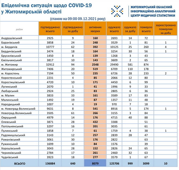 Станом на ранок 9 грудня 2021 року в Житомирській області лабораторно підтверджено 136 884 випадки коронавірусної хвороби, з них 640 виявили упродовж минулої доби, 8 грудня. Загалом від ускладнень СOVID-19 в області померли 3099 людей, упродовж минулої доби зафіксували 10 летальних випадків.