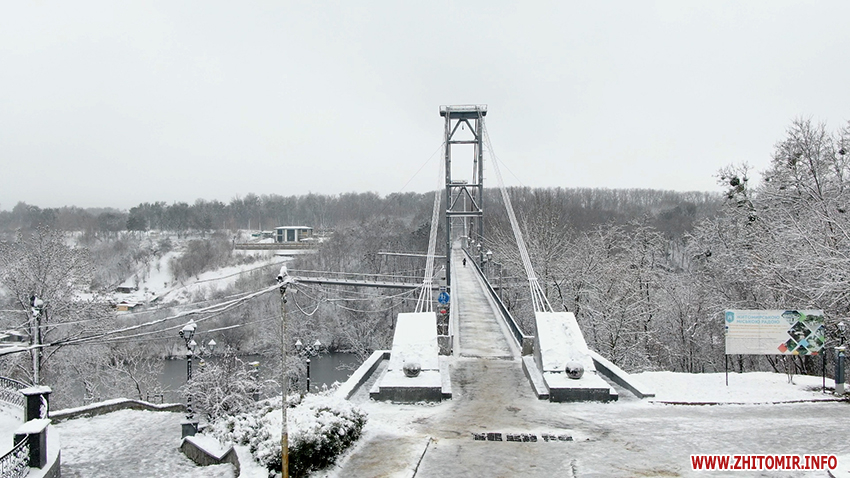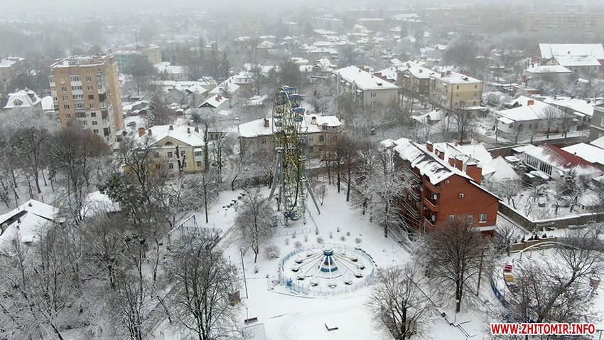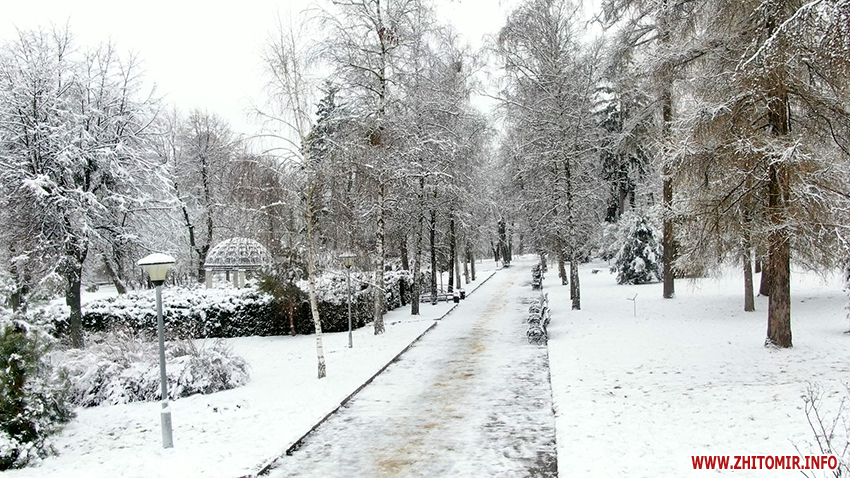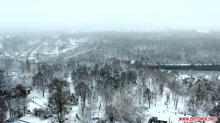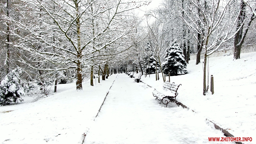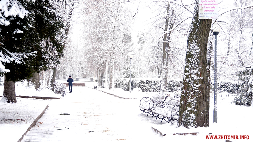 Сніжна, туманна та помірно морозна – саме так почалася зима у Житомирі. У житомирському парку імені Гагаріна 9 грудня тихо та малолюдно. Деінде на білому покривалі зі снігу утворили стежки. Річку Тетерів вкрила тонка крига. А дерева навколо неї ніби сплять тепло «одягнені» у шарфи та шапки зі снігу.