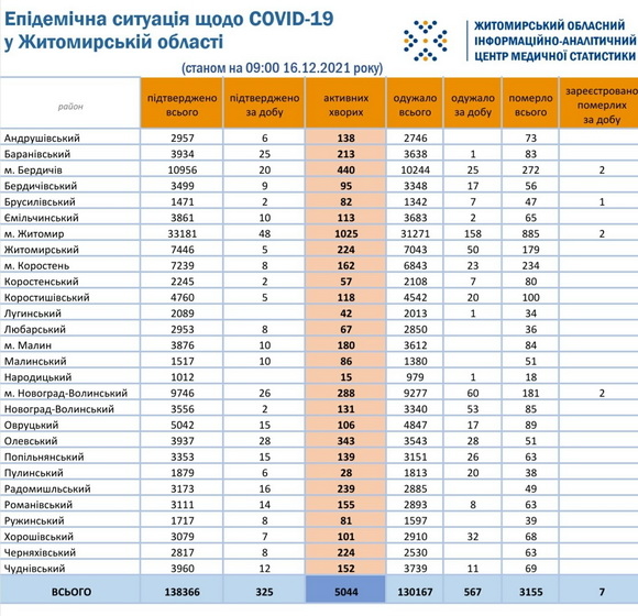 Станом на ранок 16 грудня 2021 року в Житомирській області лабораторно підтверджено 138 366 випадків коронавірусної хвороби, з них 325 виявили упродовж минулої доби, 15 грудня. Загалом від ускладнень СOVID-19 в області померли 3155 людей, упродовж минулої доби зафіксували 7 летальних випадків.