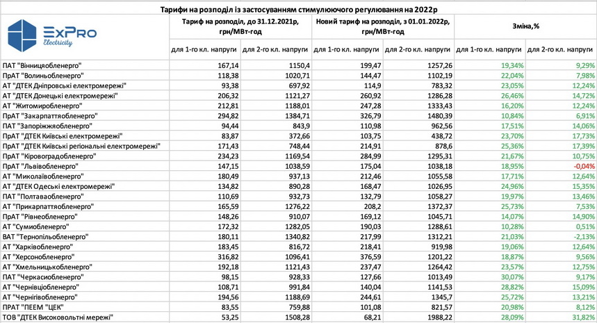 Відповідно до постанови для АТ «Житомиробленерго» були встановлені тарифи на послуги з розподілу електричної енергії із застосуванням стимулюючого регулювання з 01.01.2022 року на рівні: