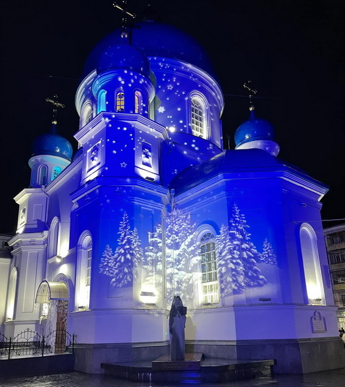 На вулиці Михайлівській у Житомирі комунальники встановили гобопроєктори, подаровані місту в 2019 році. Ялинки, сніг та зорі з’явилися на фасаді Свято-Михайлівського кафедрального собору. Щоправда, храм цьогоріч став єдиною будівлею, де транслюються різдвяно-новорічні зображення.