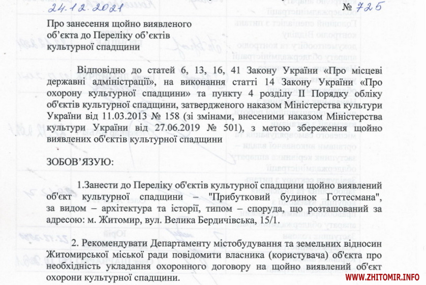 «Занести до Переліку об’єктів культурної спадщини щойно виявлений об’єкт культурної спадщини – «Прибутковий будинок Готтесмана» (виділено редакцією), за видом – архітектура та історії, типом – споруда, що розташований за адресою: м. Житомир, вул. Велика Бердичівська, 15/1», – йдеться у розпорядженні № 725.