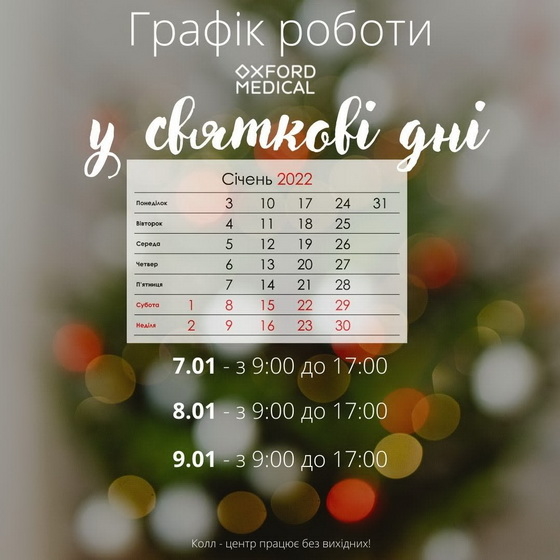 На період святкових днів клініка Оксфорд Медікал Житомир працює за звичайним графіком: