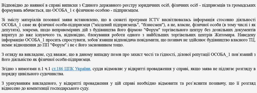 визнати недостовірною та такою, що не відповідає дійсності, принижує честь, гідність та ганьбить ділову репутацію ОСОБА_1 (Сергій Пидюра – ред.) інформацію поширену Товариством з обмеженою відповідальністю «Міжнародна комерційна телерадіокомпанія» (ICTV) 26 листопада 2021 року о 18 годині 45 хвилин в ефірі телеканалу ICTV в телевізійній програмі «ФАКТИ» в наступній частині: інформацію подану у відеосюжеті з 12 хв. 16 сек. по 12 хв. 38 сек., ведуча програми ОСОБА_2 : «Місцевий підприємець та за сумісництвом депутат міської ради блокує роботу одного з найбільших торгівельних центрів Житомира. Почалося ще рік тому, коли бізнесмен без будь-яких документів почав будівництво свого ТЦ в притул до вже існуючого. Лише втручання правоохоронців зупинило роботи, але помста не забарилася.».; інформацію подану у відеосюжеті з 13 хв. 41 сек. по 14 хв. 08 сек. голос за кадром (автор ОСОБА_3 ): «Факти говорять самі за себе. Директор заводу товариш бізнесмена та депутата міськради Житомира Сергія Пидюри. Саме його фірма «ФОРУМ» рік тому розпочала будівництво свого ТРЦ в притул до території вже зведеного торговельного центру, практично на тротуарі, при цьому не маючи на це жодного дозвільного документа. Тоді керівництво ТЦ «ОЛДІ» звернулось до правоохоронців і роботи заморозили. Та радіти було зарано. Після цього почалися проблеми з каналізацією.»; інформацію подану у відеосюжеті з 14 хв. 17 сек. по 14 хв. 23 сек. голос за кадром (автор ОСОБА_3 ): «Плюс через бездумну помсту під загрозою закриття один із найбільших в регіоні центрів вакцинації, який розміщено в ТЦ.»;