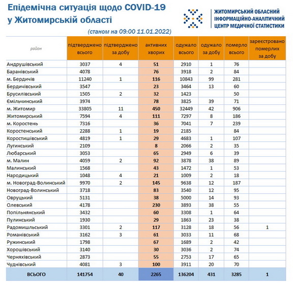 Станом на ранок 11 січня 2022 року в Житомирській області лабораторно підтверджено 141 754 випадки коронавірусної хвороби, з них 40 виявили упродовж минулої доби, 10 січня. Загалом від ускладнень СOVID-19 в області померли 3285 людей, упродовж минулої доби зафіксували 1 летальний випадок.