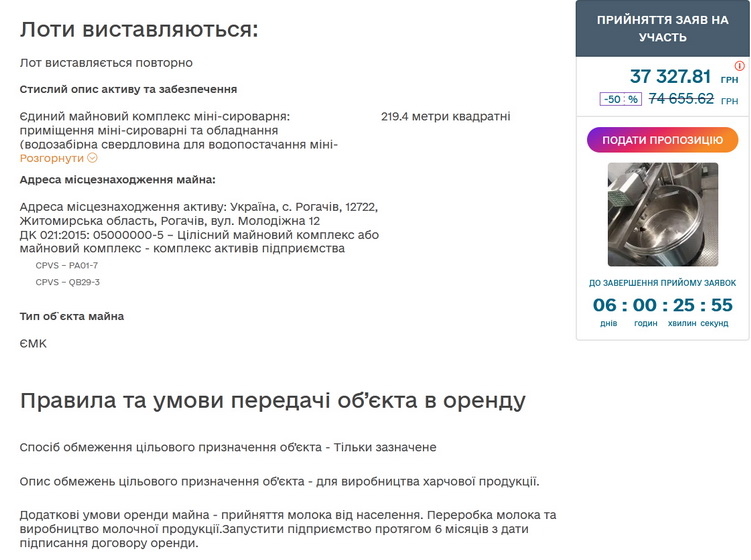 «Єдиний майновий комплекс міні-сироварня: приміщення міні-сироварні та обладнання (водозабірна свердловина для водопостачання міні-сироварні, лінія переробки молока марки СВВ-10, система контроля клімату ТСУ 1.20, система контроля клімату ТСУ 1.22, система холодопостачання ТС 1.21), розташований по вул. Молодіжна 12, с. Рогачів, Житомирської області, загальною площею 219,4 кв.м», - зазначається в описі об’єкту на майданчику «Прозорро.Продажі».