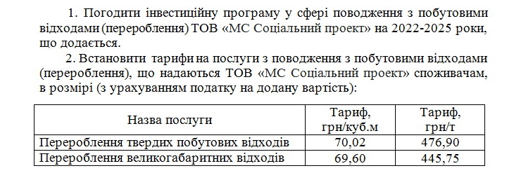 Скріншот з проєкту рішення виконкому «Про погодження інвестиційної програми ТОВ «МС соціальний проект» та встановлення тарифів на послуги з поводження з побутовими відходами (перероблення)», що був оприлюднений на сайті міської ради 28 грудня 2021 року