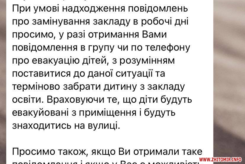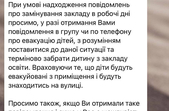 «При умові надходження повідомлень про замінування закладу в робочі дні, просимо, у разі отримання Вами повідомлення в групу чи по телефону про евакуацію дітей, з розумінням поставитися до даної ситуації та терміново забрати дитину з закладу освіти. Враховуючи те, що діти будуть евакуйовані з приміщення і будуть знаходитися на вулиці. Просимо також за можливістю долучитися до охорони території закладу освіти …», – йдеться у тексті повідомлення.