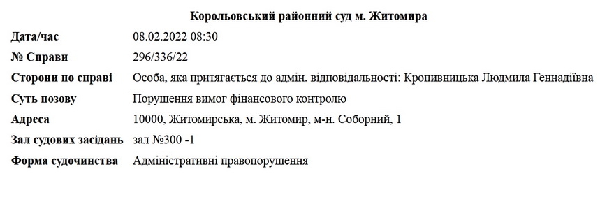 Корольовський районний суд м.Житомира 8 лютого 2022 року буде розглядати справу про адміністративне правопорушення депутата Житомирської міської ради Людмили Кропивницької.