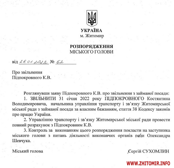 «Звільнити з 31 січня 2022 року Підпокровного Костянтина Володимировича, начальника управління транспорту і зв’язку Житомирської міської ради з займаної посади за власним бажанням», - йдеться у документі.