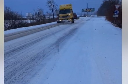 Дорожнє покриття засніжене, хоч і постійно очищається від опадів. Хурделиця триватиме увесь день.