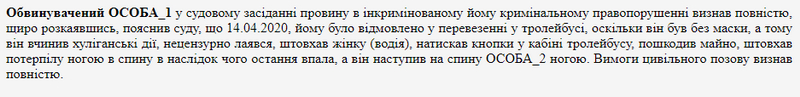У матеріалах суду зазначено, що 14 квітня 2020 приблизно об 11.20 на зупинці громадського транспорту «Ольжича», що на вул. Перемоги в Житомирі, обвинувачений зайшов до тролейбуса №2. Йому було відмовлено в перевезенні, через відсутність захисної маски (згідно рішення виконавчого комітету Житомирської міської ради № 423 від 06.04.2020).