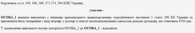 Суд врахував каяття, позитивну характеристику за місцем проживання обвинуваченого, відсутність судимостей, а також те, що молодик не перебуває на обліках у нарколога чи психіатра. Тож своєю ухвалою визнав винним обвинуваченого у хуліганстві і присудив 8500 грн штрафу.