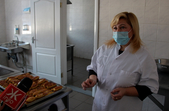 «Усім діткам та мамам насичений пшоняний суп, картопляне пюре, для діток є тефтелька парова і м’ясний фарш, у нас на сьогоднішній день двоє діток на прикормі з шести місяців до року. І сьогодні у нас зрази, для діток з 4 до 18 років, зрази картопляні з м’яса і салатом, на порцію — дві зрази, тобто їхній вихід 140 грамів і компот із сухофруктів. Мам (з дітьми до шести років) ми годуємо, єдиний мінус, що мама у нас не отримують яких м’ясних страв» , — розповідає дієтсестра КП «Дитяча лікарня імені В.Й. Башека» Оксана Павлюк.