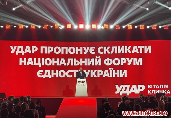 «Будемо єдиними та сильними всередині країни – будемо сильними ззовні! Тому партія «УДАР» пропонує скликати Національний форум єдності України. Цей Форум має стати платформою єднання держави. Його мета – продемонструвати і суспільству, і всьому світу консолідацію усіх здорових політичних сил навколо захисту країни. Існують проблеми українців, які треба вирішувати разом. Сьогодні свій заклик до консолідації дій я адресую усім, від кого залежить доля країни. Пропоную скликати Національний форум єдності України і узгодити першочергові кроки, які підсилять державу, зроблять економіку більш стійкою, а українців більш захищеними. Боротися треба не один проти одного, а за Україну», – наголосив Віталій Кличко.