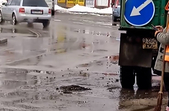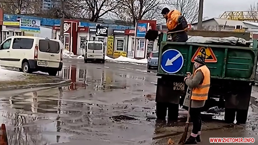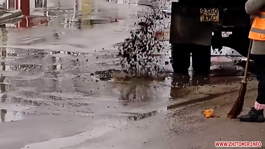 10 лютого у соцмережі оприлюднили відео, на якому біля залізничного вокзалу в Житомирі працівники КП «Управління автомобільних шляхів» закидають калюжі асфальтом.