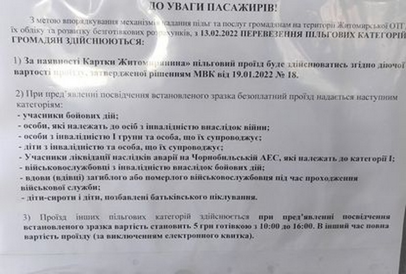 У житомирських маршрутках з’явилися оголошення про те, що з 13 лютого перевезення пільгових категорій громадян здійснюються за наявності «Картки Житомирянина», а при пред’явленні посвідчення встановленого зразка пільги надаються лише восьми категоріям пільговиків.