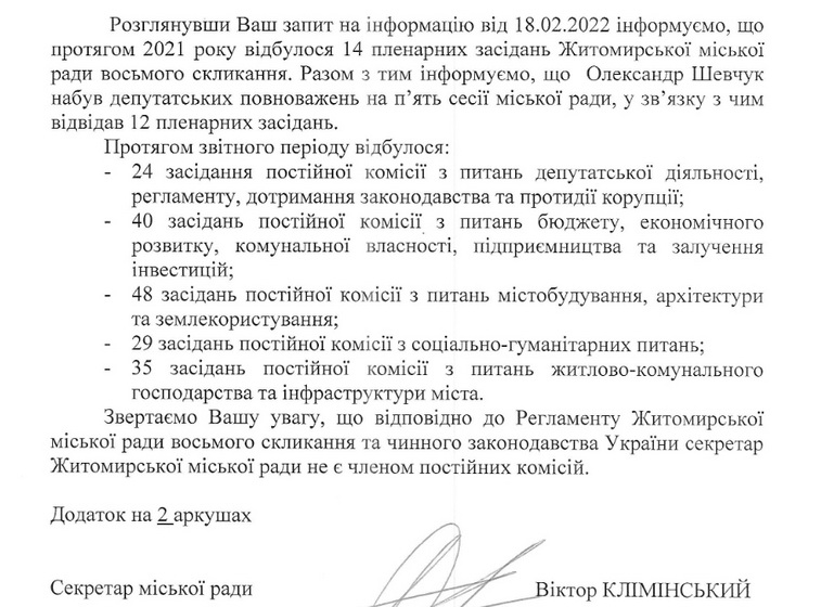 Така інформації міститься у відповіді відділу організаційного забезпечення депутатської діяльності Житомирської міської ради на інформаційний запит Житомир.info.