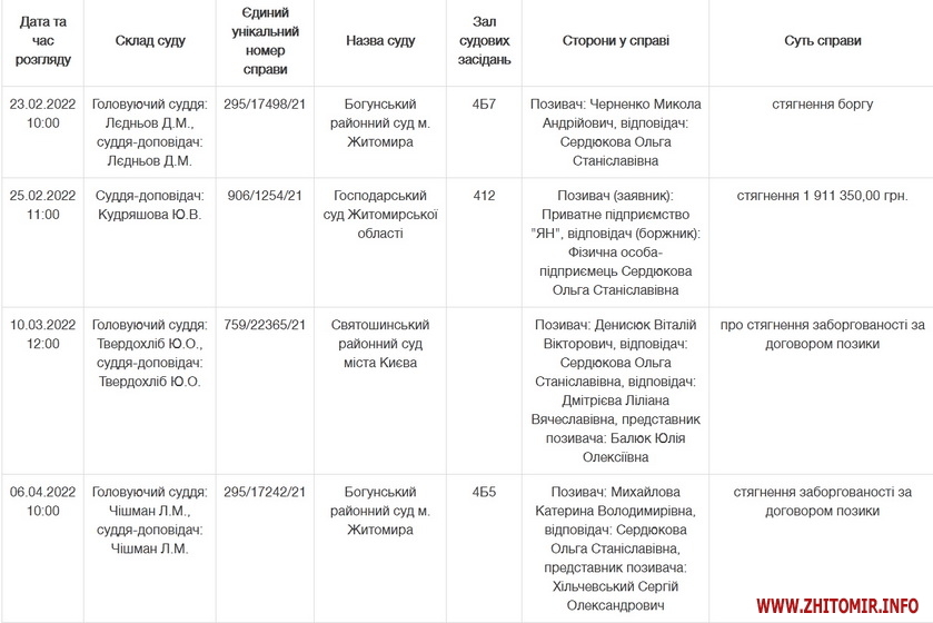 Станом на 22 лютого 2022 року у двох житомирських та одному київському суді розглядаються справи про стягнення боргів: