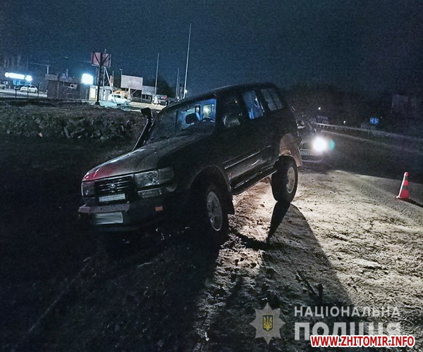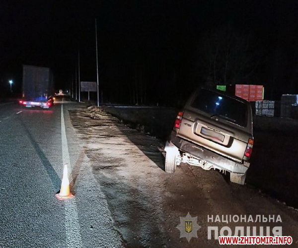 Увечері 22 лютого поблизу Зарічан Житомирського району позашляховик збив 30-річного пішохода, який переходив дорогу, чоловіка госпіталізували. А вранці цього ж дня на автодорозі неподалік Малина легковик з’їхав у кювет, де перекинувся, постраждала 70-річна пасажирка.