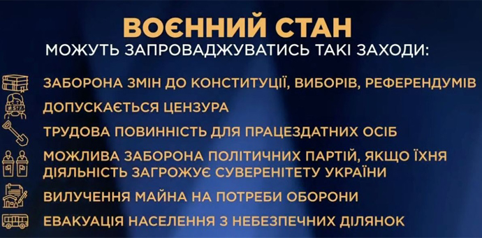 23 лютого на засіданні РНБО вирішили запровадити в Україні надзвичайний стан на 30 днів, рішення має затвердити Верховна рада. Увечері цього ж дня Верховна рада затвердила відповідний указ президента, а мер Житомира пояснив, які обмеження діятимуть у місті.