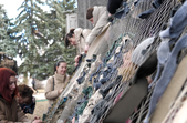 «Найперша необхідність, це рибальська сітка з капронової нитки. Будь ласка, приносьте, бо фабрика зачинена і ми не можемо її зараз закупити. Вічко має бути бажано — 4-4,5 см, це в ідеалі, але якщо буде 3 см — теж приймемо. По-друге, потрібні самі стрічечки, які вплітають. Стрічки ви можете самостійно нарізати вдома, ширина — 3 см, довжина — бажано до 1 м. Кольори такі, які ви бачите в природі, хакі, пісочний, світло коричневий, болотяний. Сьогодні людей тут багато. плетуть на вулиці біля Богунської районної ради, сюди можна приносити всі ці стрічечки і здавати сюди черговому, ми заберемо», — розповідає волонтерка Анастасія.