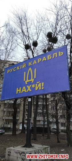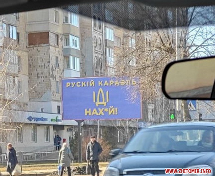 Вранці 28 лютого на вулицях Житомира люди помітили білборди з крилатою фразою українських прикордонників з острова Зміїний та надіслали фото редакції (див. внизу новини).