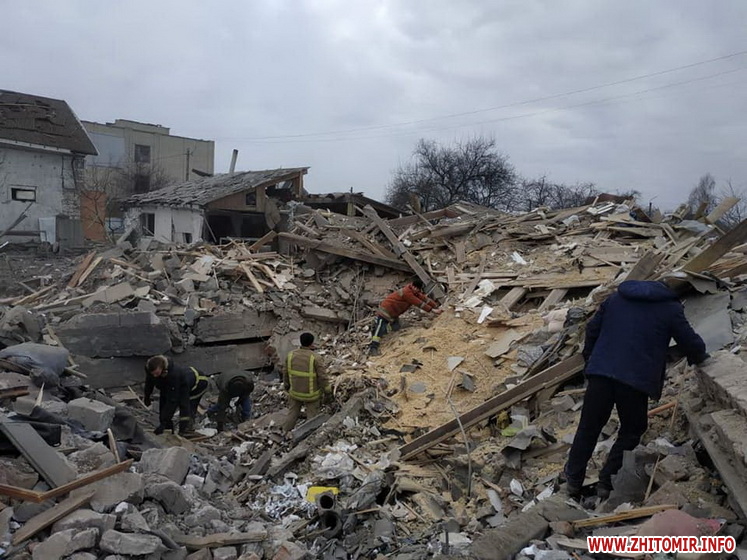 «Близько 21:00 6 березня у м. Коростень внаслідок повітряного удару вибито вікна у триповерховій будівлі ЗОШ №2. Загиблих немає, 1 людина отримала травми. Для проведення пошуково-рятувальних робіт залучено 1 одиницю техніки та 3 чоловіки особового складу 8 ДПРЧ м. Коростень. Крім того, приблизно у цей же час у м. Овруч Коростенського району також внаслідок повітряного удару зруйновано будівлю Овруцького центру зайнятості, повністю два двоповерхових житлових будинки. Зазнали пошкоджень (вибиті вікна, двері) кілька багатоквартирних житлових будинків (інформація наразі уточнюється). Під час поквартирного обходу бійцями ДСНС з метою виявлення постраждалих, в одній із квартир на 5-му поверсі рятувальники знайшли жінку похилого віку, яка перебувала в шоковому стані, не могла рухатися і потребувала допомоги. Рятувальники викликали на місце події екстрену медичну допомогу, лікарі нормалізували стан жінки, від подальшої госпіталізації вона відмовилася. Для проведення пошуково-рятувальних робіт залучено 2 одиниці техніки та 11 рятувальників 12 ДПРЧ м. Овруч», - йдеться у повідомленні.