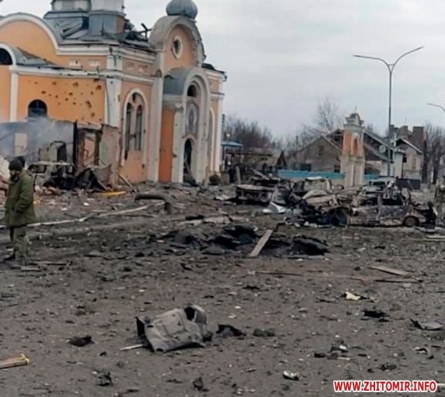 У Коростені ракетний обстріл було здійснено по центральній частині: історичному серцю древнього міста, популярного і знаного багатьма як місце проведення всеукраїнського фестивалю дерунів. Зруйновано адміністративні будівлі, пошкоджено вікна та стіни у довколишніх оселях.