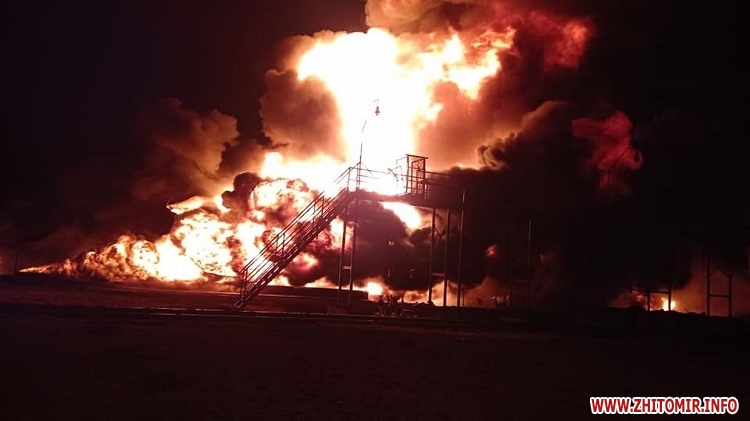 «7 березня близько 20:20 внаслідок двох авіаударів сталося влучання в нафтобази у м. Житомир та смт Черняхів. У Житомирі виникло загоряння резервуару ємністю 10 м. куб. Попередньо жертв та постраждалих немає. До гасіння залучено 20 осіб та 4 од. техніки ДСНС», – йдеться повідомленні.