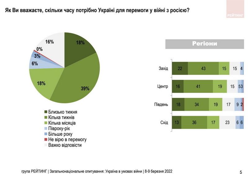 57% вважають, що Україна зможе перемогти у війні з росією вже у найближчі тижні: 18% думають, що ми переможемо за тиждень, 39% - за кілька тижнів. Ще 18% вважають, що війна триватиме кілька місяців, лише 9% думають, що війна закінчиться за півроку-рік чи більше. Тих, хто взагалі не вірить в перемогу, практично немає. 16% не змогли відповісти на це питання. Найбільш оптимістично налаштовані мешканці західного регіону, але і в інших областях більшість вірить, що війна триватиме недовго.