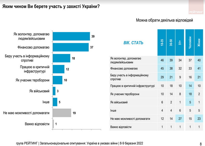 Більше 80% відповіли, що якимось чином допомагають у захисті України: зокрема 39% опитаних зараз допомагають людям і армії як волонтери, 37% - допомагають фінансово. Також 18% беруть участь в інформаційному супротиві, 12% - продовжують працювати в критичній інфраструктурі. 10% українців зазначили, що є учасниками територіальної оборони. Тільки 19% відповіли, що не мають змоги допомагати зараз країні. Частіше – це старші люди. Однак і серед старших більшість сьогодні залучені до супротиву.