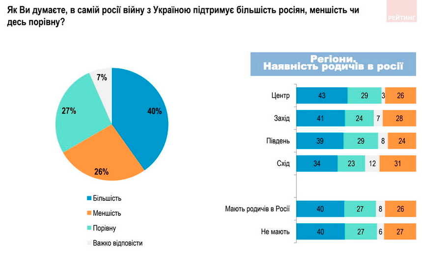 40% українців впевнені, що більшість росіян підтримують війну проти України. Ще чверть опитаних вважають, що в росії кожен другий підтримує війну, і чверть думають, що прихильники війни там в меншості.