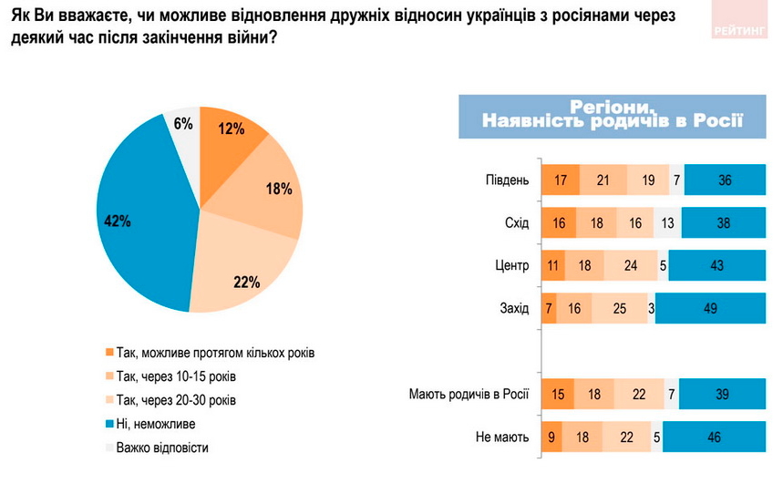42% вважають, що про відновлення дружніх стосунків українців з росіянами взагалі не може бути мови. 22% думають, що це можливо за 20-30 років після війни, 18% - що за 10-15 років, і лише 12% вважать відновлення дружби можливим за пару років після війни. Трохи більше вірять у відновлення стосунків мешканці Півдня та Сходу, та ті, хто має родичів в росії. Але і серед них більше третини взагалі не вірять у повернення дружби між народами.