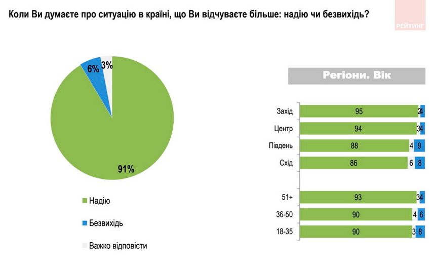 За результатами опитування 91% опитаних, думаючи про ситуацію в країні, відчувають надію. Лише 6% відчувають безвихідь. У всіх регіонах спостерігається максимальний рівень відчуття надії.