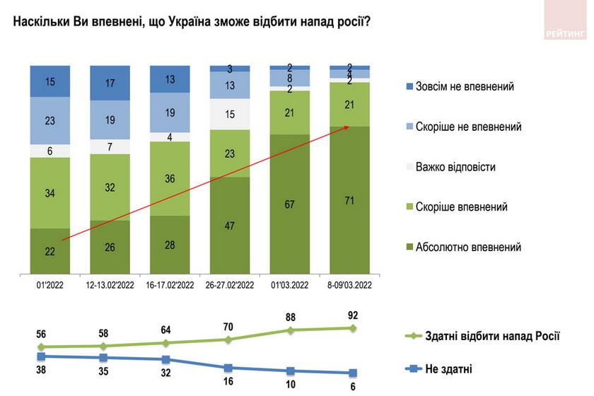 92% опитаних вірять у те, що Україна зможе відбити напад росії. Практично щодня цей показник зростає. Лише 6% сьогодні не мають такої впевненості. Віра у перемогу переважає в усіх регіонах країни.