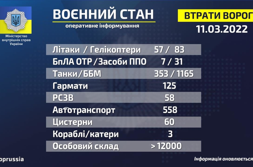 Загальні бойові втрати противника з 24.02 по 11.03 орієнтовно склали: