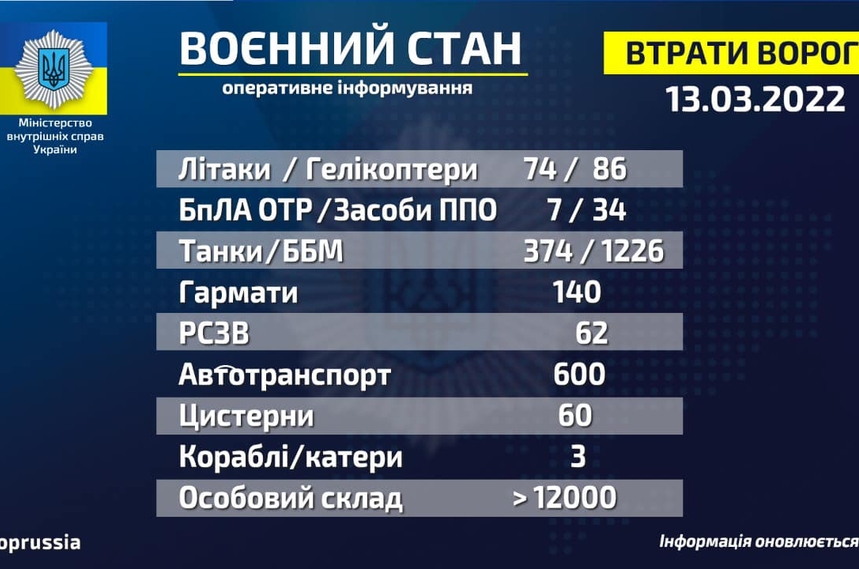 Загальні бойові втрати противника з 24.02 по 13.03 орієнтовно склали: