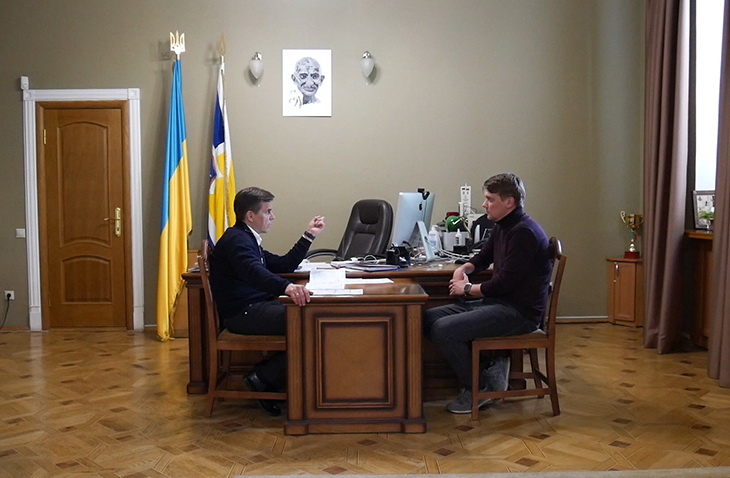 Портрет Ґанді в кабінеті мера Житомира, червень 2020 року. Зауважимо, що в травні 2019 року в кабінеті над кріслом висіла картина.