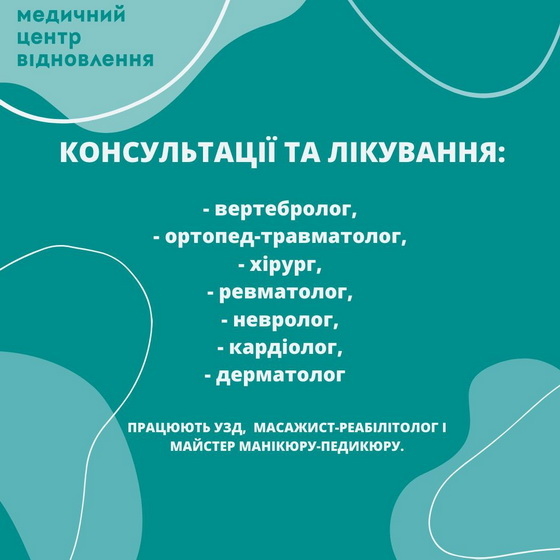 Тож ми продовжуємо прийом пацієнтів: з понеділка по п’ятницю з 8-00 до 15-00. Прийом проводять наступні лікарі: вертебролог, ортопед-травматолог, хірург, судинний хірург, ревматолог, кардіолог, невролог, дерматолог, лікар УЗД. Також працюють масажист-реабілітолог.