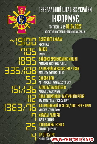 Окрім того, за даними Генштабу, загальні бойові втрати противника з 24.02 по 09.04 орієнтовно склали: